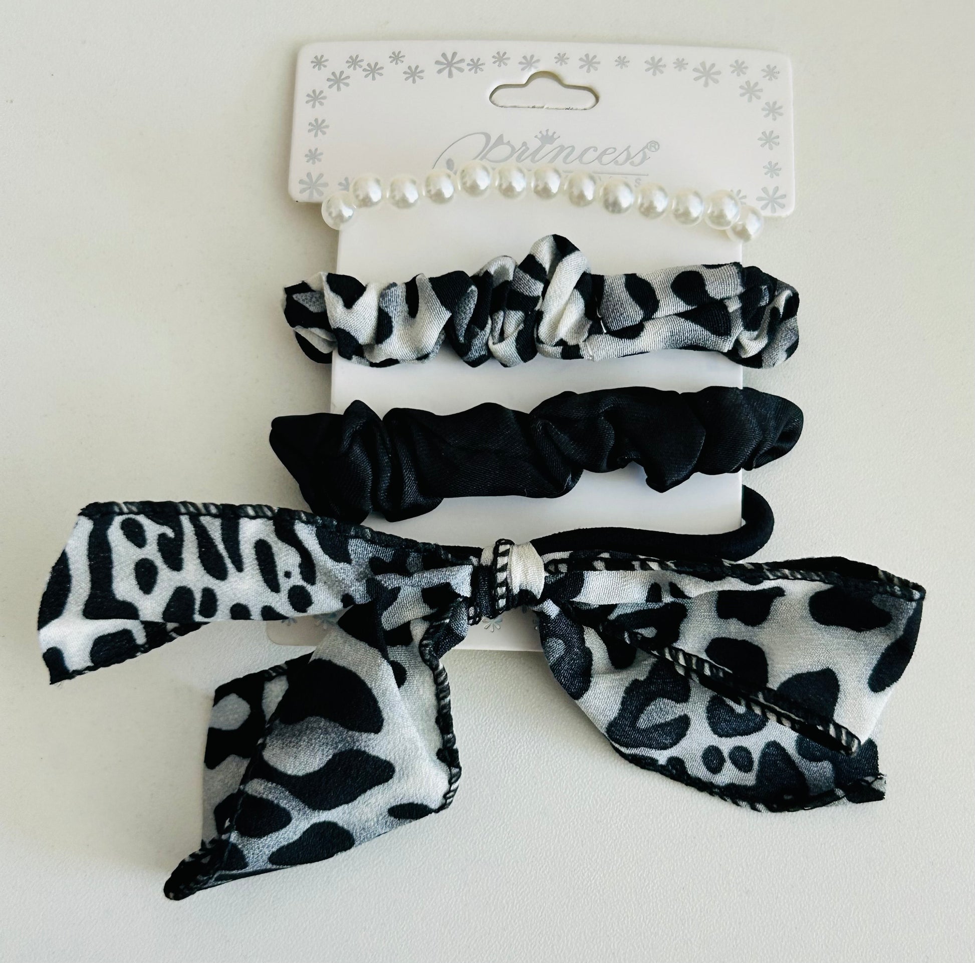 A little bit of Savage and a little bit of Chic. Get ready to unleash your wild side with these stretchy hair ties that include a pearl tie, two scrunchies and a bow with a soft elastic tie.