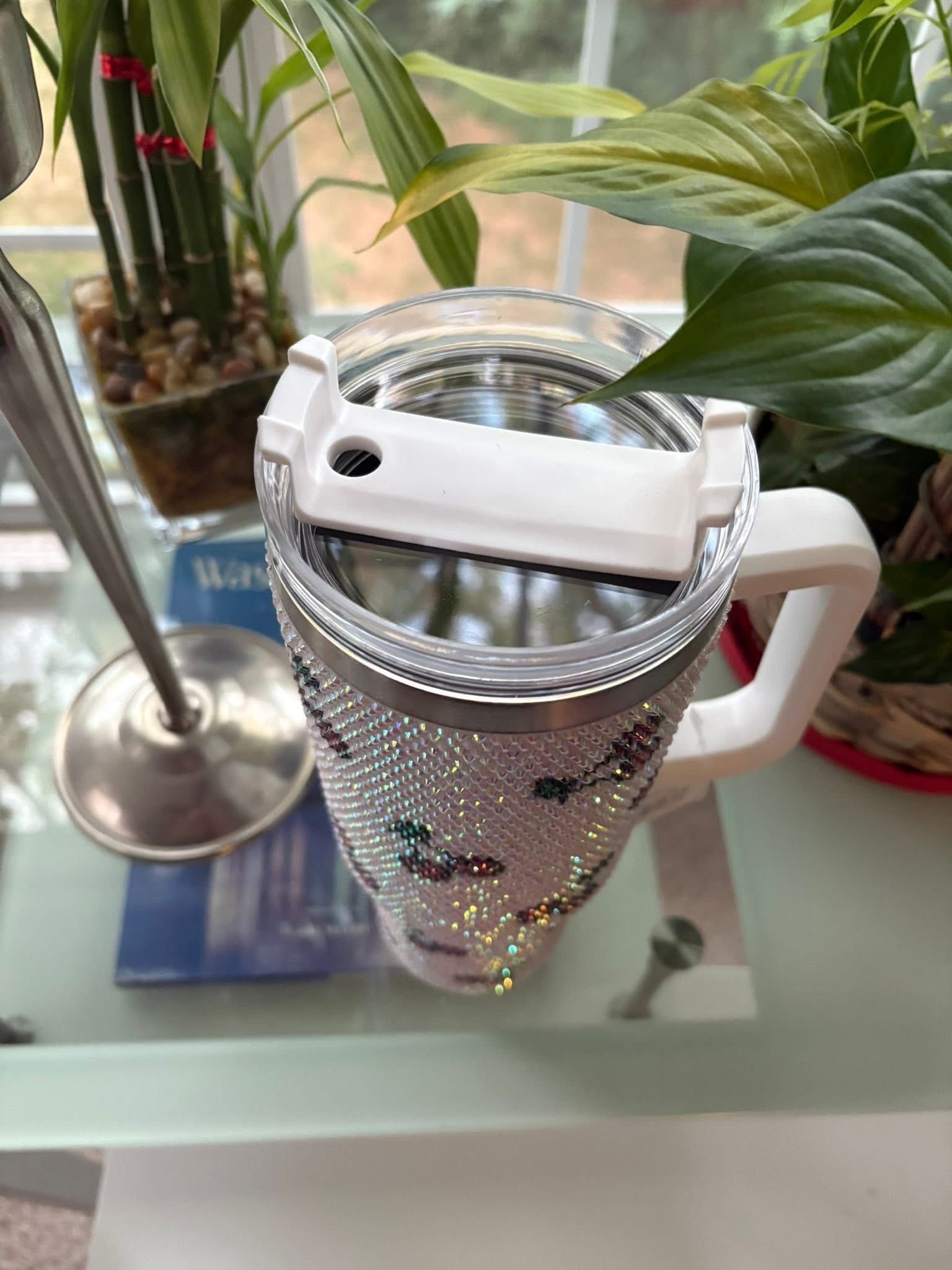 This stunning super chic durable stainless steel tumbler is sure to catch everyone's eye with its full crown of dazzling rhinestones for that extra glam factor. The cherries give that Summer vibe but also look great all year round. It has a comfy handle for easy gripping, a spill-resistant lid, a reusable straw AND it also fits right in your car cup holder. It will keep your drinks ice-cold for hours or piping hot on those long road trips.